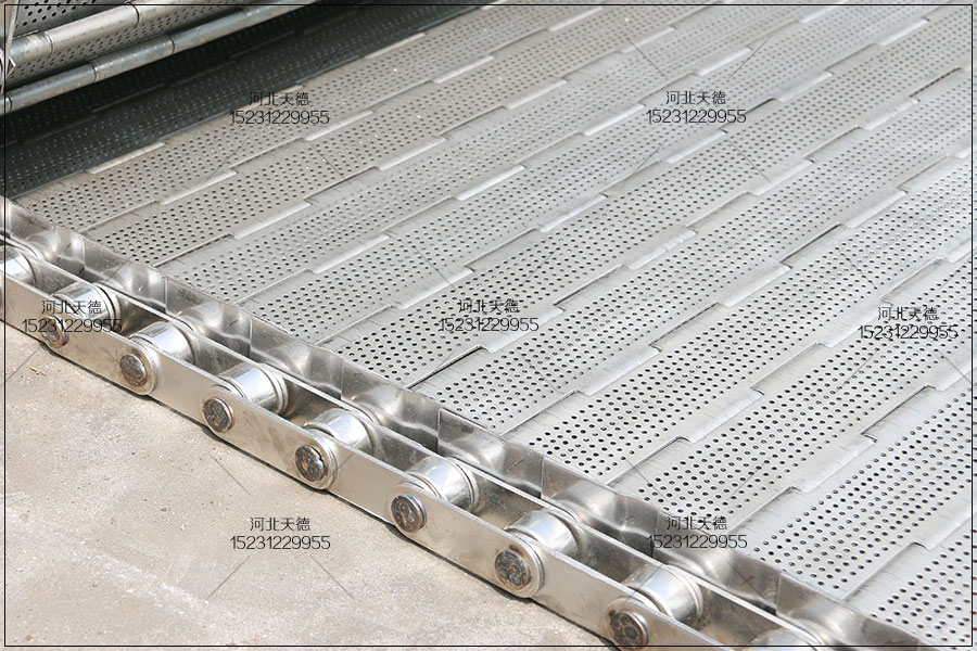 6)當金屬鏈條不銹鋼鏈板帶輸送帶破壞嚴重,較長的鏈板輸送帶用舊帶拖拽新帶進行更換。 金屬鏈條不銹鋼鏈板帶