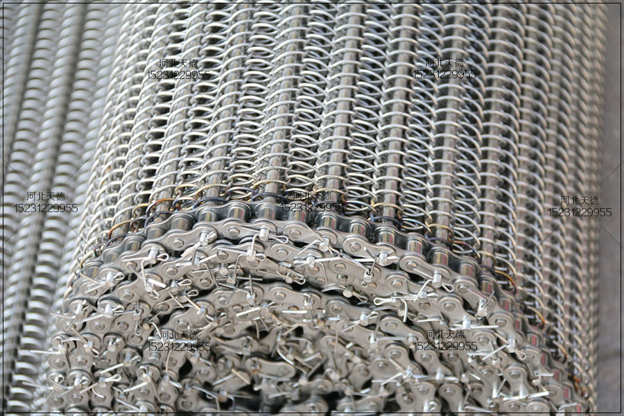 大滾珠輸送鏈輸送平穩,拉力大不跑偏,下面圖片展示的鏈條輸送帶總寬度是1米,長度為30米,絲徑采用1.5毫米的鋼絲壓彎編織的,編織孔大小為8*15毫米的。