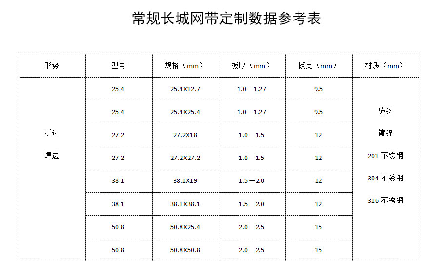 長城網帶材質:有A3低碳鋼、45#鋼、1Cr13耐熱鋼、 不銹鋼、304不銹鋼、1Cr18Ni9Ti不銹鋼、0Cr18Ni14NO2CU2耐熱耐酸鋼等