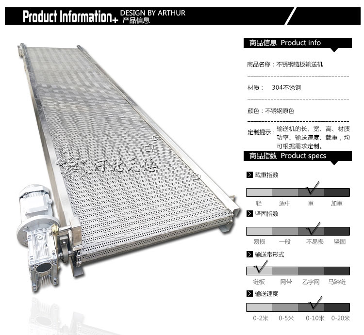 應用行業有:食品加工、速凍加工、設備組裝、金屬件輸送、機床排屑,況且在這些行業中對鏈板輸送機的使用型號也不一樣。平頂鏈板式輸送機適合高速輕型產品輸送機;折彎鏈板式輸送機適合重型、體積大產品輸送;合頁鏈板式輸送機適合稍重、細小產品輸送。大家在購買時一定注意要根據自己產品來選型。